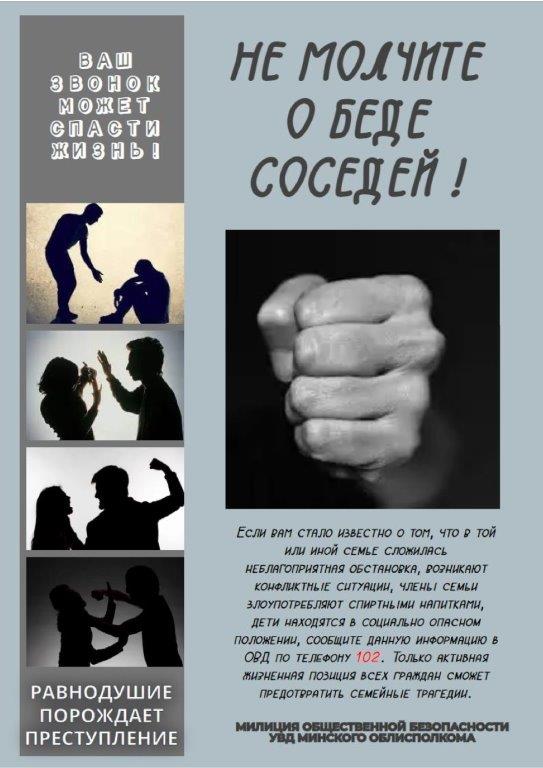 Довести до граждан информацию о возможностях государственных органов и общественных объединений в решении проблем насилия в семье, положения Закона Республики Беларусь от 4 января 2014 года «Об основах деятельности по профилактике правонарушений».
